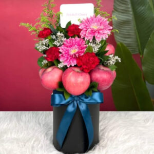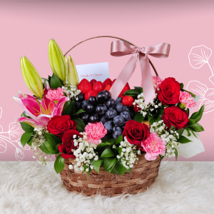 An abundant display of nature’s finest treasures and floral elegance! This oversized basket is overflowing with a lavish assortment of fresh fruits, including crisp apples, succulent pineapple, creamy bananas, tangy kiwis, luscious mangoes, plump grapes, exotic dragon fruit, sweet pears, and juicy oranges – a veritable cornucopia of flavors and colors. But that’s not all – interspersed among the fruits are delicate roses, vibrant carnations, and a variety of fresh flowers, adding a touch of fragrance and beauty to this magnificent arrangement