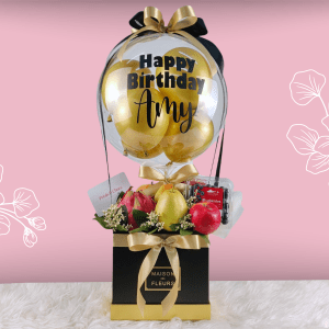 It’s filled with yummy grapes, crunchy apples, and juicy oranges, plus a shiny balloon for extra fun. Whether it’s for celebrating something special or just to make someone’s day brighter, this basket is sure to bring a big smile to their face!