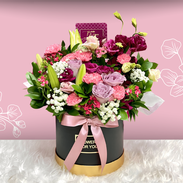 A box filled with a stunning array of flowers! This beautiful arrangement features elegant roses, fragrant lilies, delicate eustomas, and a mix of other fresh blooms. Our Bloom Parcel Delight is sure to bring joy and beauty wherever it goes.