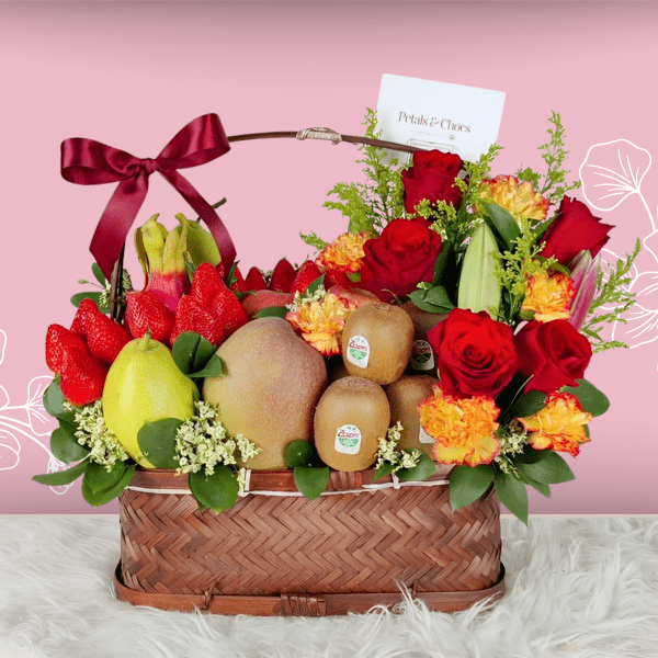 A perfect indulgence for any occasion its like a taste of paradise in a basket! Inside, you’ll find juicy strawberries, sweet mangoes, crisp apples, juicy pears, tangy kiwis, and exotic dragon fruit – a delicious mix of tropical flavors. And to make it even more special, there are beautiful carnation, roses, and colorful flowers mixed in too! This basket has everything you need to feel like you’re on vacation!
