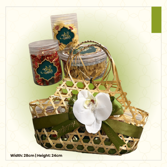 Whats inside: Pineapple Tarts, Melting Semperit Cookies, Peanut Candy, Bamboo Basket, Decoration Raya, Raya Greeting Card
