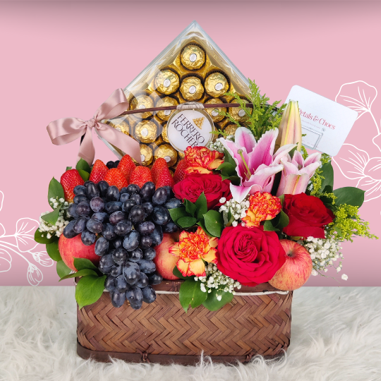 A heavenly combination of sweet indulgence and floral elegance! Inside this enchanting basket, you’ll find Ferrero Rocher chocolates, juicy strawberries, tasty grapes, and crisp apples – perfect for satisfying any sweet tooth. Plus, there are beautiful carnations, lilies, roses, and colorful flowers mixed in too, adding a pretty touch. This basket has everything you need for a delightful surprise!