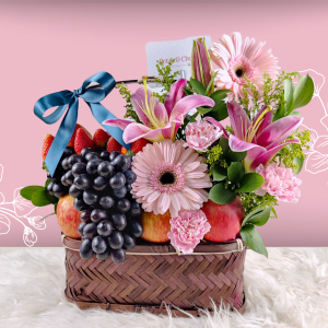 It’s like a mini garden filled with beautiful flowers and yummy fruits! Inside, you’ll find fresh lilies, pretty roses, and colorful flowers, all adding a lovely touch to any room. And to make it even better, there are juicy grapes, crunchy apples, and sweet strawberries mixed in too! This basket has everything you need to spread happiness and cheer!