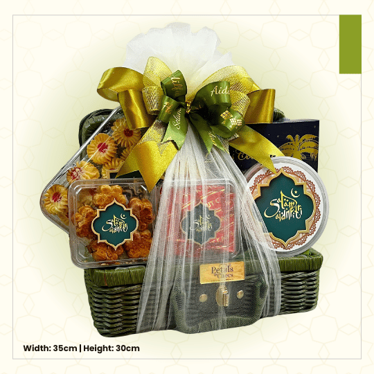 Whats inside: Date Cookies, Pineapple Tarts, Melting Semperit Cookies, Nutty Mazola, Peanut Candy, Rattan Basket, Decoration Raya, Greeting Card