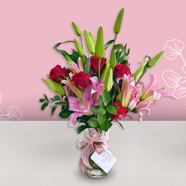 A charming arrangement of fresh lilies and roses elegantly presented in a glass vase! Perfect for adding a touch of beauty and fragrance to any room. Whether you’re looking to enhance your home decor or surprise someone special with a thoughtful gift, our Bloom and Glass Display is sure to impress with its natural charm and elegance.