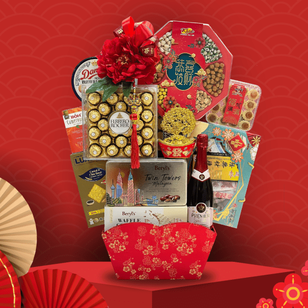 Whats inside: Ginseng Herbal Soup & Red Dates, Mixed Nuts, Premium Pineapple Tart, Ferrero Rocher, Beryls Twin Towers, Beryls Waffle, Danisa Butter Cookies, Luxury Biscuits, Sparkling Drink, Boh Tea, Assorted Cookies, CNY Accessories with Artificial flowers, CNY Basket