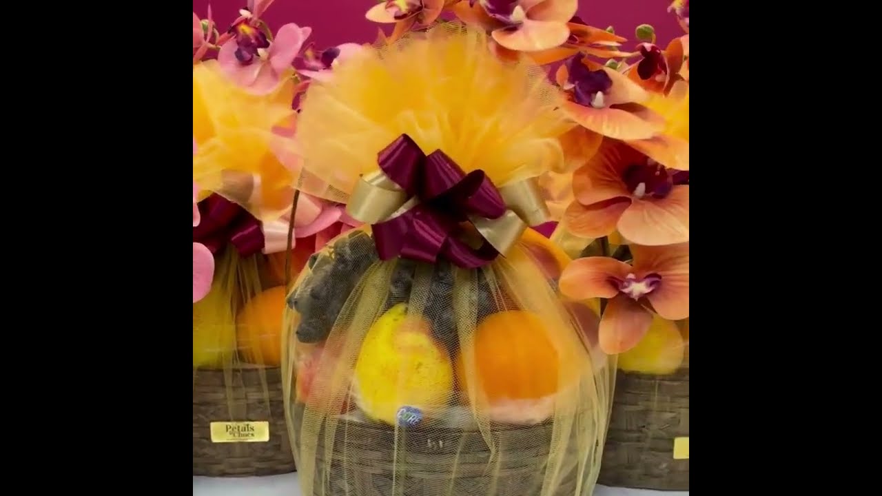 it’s like a little garden in a basket! Inside, you’ll find tasty grapes, crunchy apples, and juicy oranges, all ready to be enjoyed. And to add a special touch, there’s a beautiful orchid flower standing tall among the fruits, bringing a bit of nature’s elegance to the mix. Whether you’re celebrating something special or just want to brighten someone’s day, this basket is sure to do the trick!”