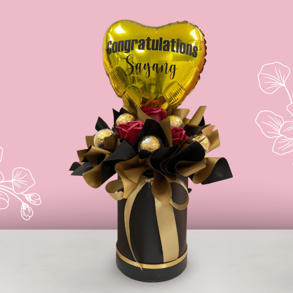 Whats inside: Ferrero Rocher, Soap Rose, Foil Balloon, Personalized Message on Foil Balloon & Greeting Card