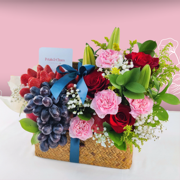 Introducing our Seroja Honey – it’s like a little garden in a bamboo basket! Inside, you’ll find juicy strawberries, tasty grapes, and crunchy apples – perfect for giving a gift. Plus, there are pretty flowers mixed in too, adding a nice touch of color and freshness. This basket has everything you need for someone to enjoy a lovely fruity!